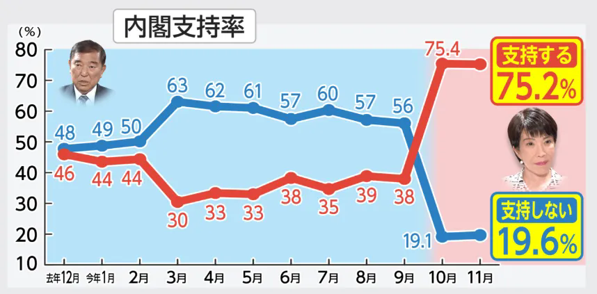 看看她执政一个月以来的支持率多高就知道了,达到了惊人的75.2%,这就是日本人真实的心声。而那个敢批评她的前首相石破茂反倒被骂得不敢出门。