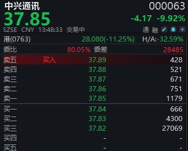 【大河财立方消息】12月11日,中兴通讯AH股开盘后双双大跌,午后跌幅则进一步扩大,其中A股一度触及跌停盛金缘证券,截至发稿报37.85元/股;H股跌幅一度扩大至13%。